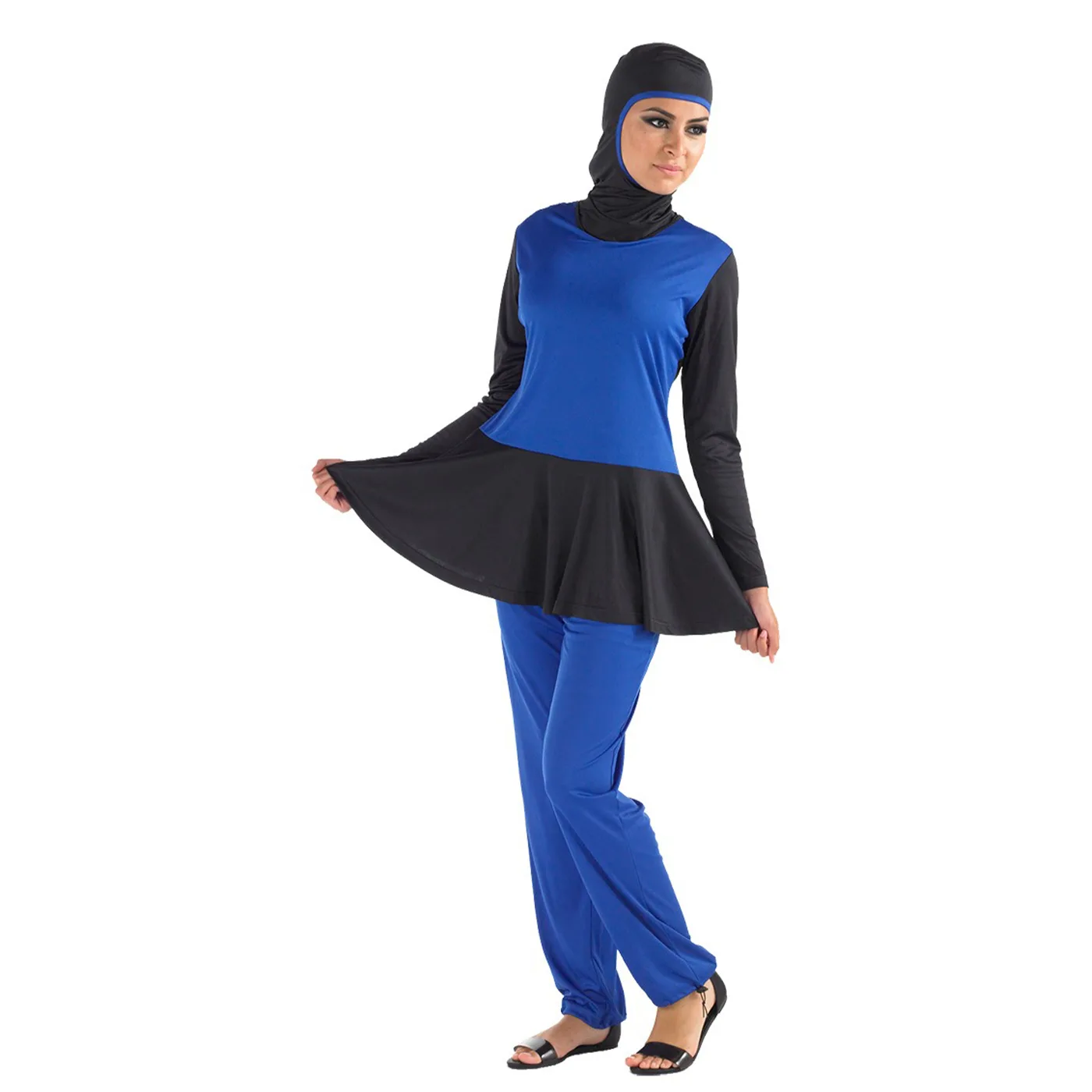 The Islamic Burkini Modest Swimwear has been designed according to the Islamic dress code, exposing only the face, hands, and feet. The swimwear includes three items: a long shirt, swim tights, and a hijab cap.